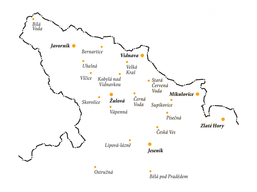 Vodní díla na horním toku Bělé • Sirkárna Bernartice • Likérka Alberta Michlera v Bukové • Plnicí pera HARO z Bílé Vody • Kamenická firma H. Kulka & Co. • Těžba zlata na Zlatém chlumu • Uranový důl na Zálesí • Důl na arsen v Račím údolí • Od Raymanna k Moravolenu Jeseník • Sklárna u Vražedného potoka • Textilní továrna Volpini & Söhne • Celulózka a papírna Písečná • Těžba železné rudy v Hraničné • Nerealizovaná železnice do Supíkovic • Důl na lignit a cihelna v Uhelné • Sirkárna Horní Fořt • Šachtové vápenky ve Velkých Kuněticích • Kruhové vápenky ve Vápenné • Gala Hukovice • Vidnavská šamotárna • Závod Zlaté Hory, n. p. RD Jeseník  • Železárny v údolí Javorné